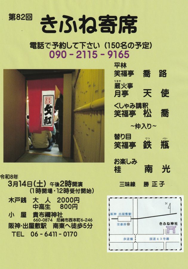 少し先ですが、令和8年3月14日14時より 第82回きふね寄席 が行われます